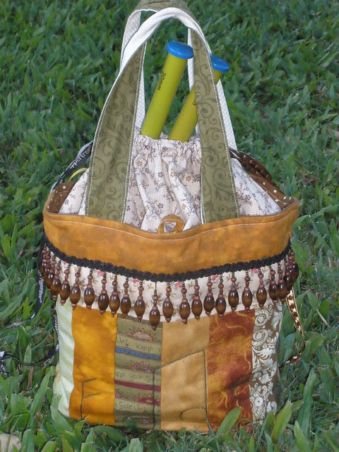 I sewed the corners a bit deeper to lessen the height then added the draw string top. I cut a 30cm (12 inch) strip width of fabric, folded it lengthwise and interfaced half. I made buttonholes for the draw string and stitched a casing then sewed gathering rows along the raw edge. I gathered the strip onto the bag so I could open it right up easily with the extra width. I stitched two lengths of brown ribbon together, I got them off things I bought, and the new length just fit nicely.